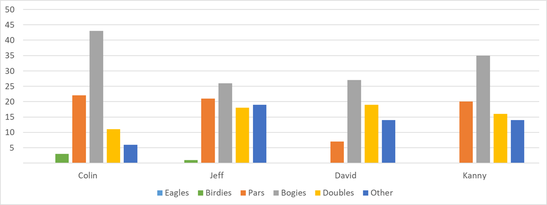 | Eagles | Birdies | Pars | Bogies | Doubles | Other | |||